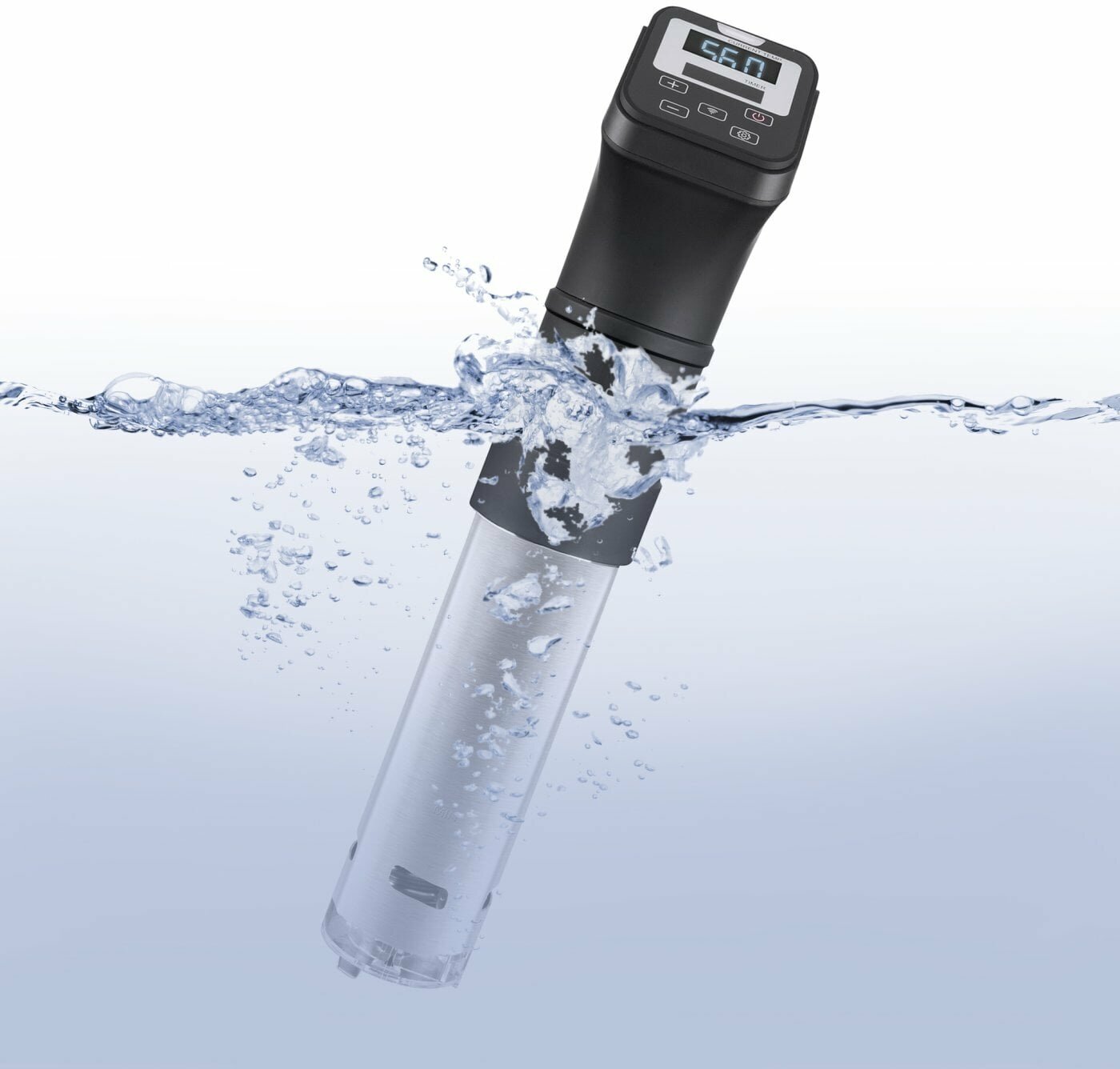 Погружной термостат мощностью 1200 ватт, оборудован системой циркуляции воды 10 л/мин. Устройство выполнено в современно дизайне, оснащено светодиодным дисплеем, что делает его незаменимым в процессе приготовления полезной и вкусной пищи методом су-вид. Нагревательный элемент рассчитан для бытового использования. Вода нагревается до заданной температуры быстро, после чего устройство переходит в режим ожидания для поддержания постоянной температуры в емкости.