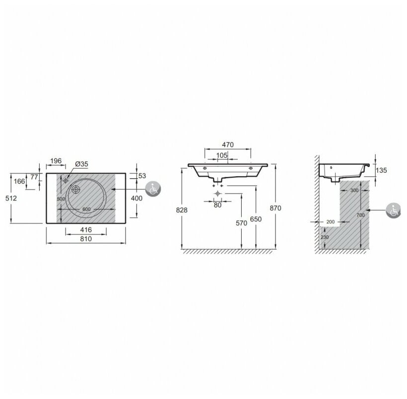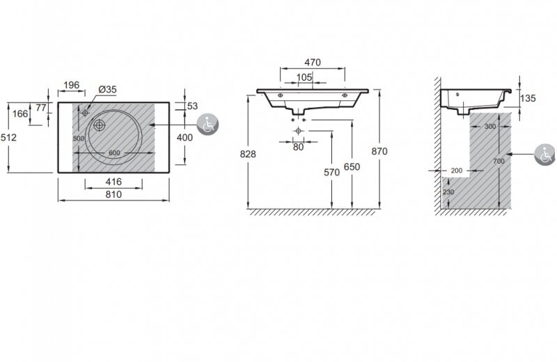 установки на мебель), 80 см. 1 отверстие для смесителя.