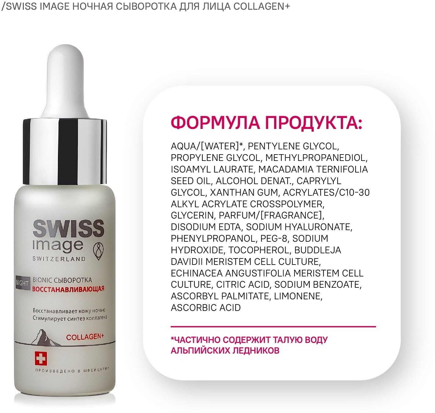 Талая вода альпийских ледников, богатая ценнейшими минералами, мгновенно увлажняет и обновляет кожу, насыщает клетки кожи кислородом и улучшает обмен веществ.