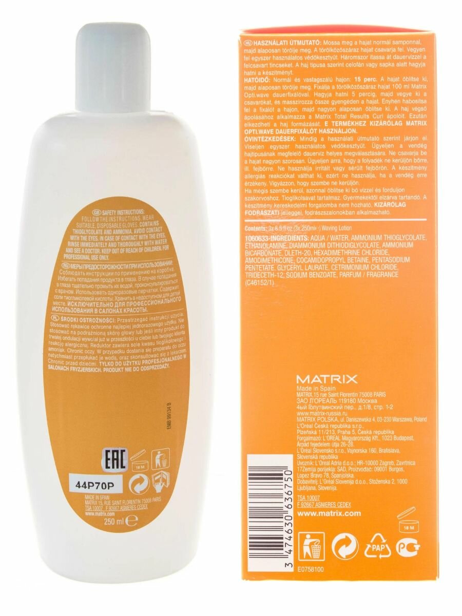 | Способ применения | Вымыть волосы нейтральным шампунем и тщательно отжать. Надеть защитные перчатки.При завивке: приступить к накрутке. Нанести лосьон Опти.вейв на все бигуди, сделать три последовательные пропитки. Оставить действовать под целлофаном или полотенцем в зависимости от типа волос. Без теплового воздействия.Время выдержки: Нормальные или трудно поддающиеся волосы - 15 минут. Волосы тщательно промыть и промокнуть полотенцем. Нанести 100 мл фиксатора-нейтрализатора Опти.вейв. Выдержать 5 минут. Снять бигуди и слегка помассировать кончики волос. Осторожно вспенить фиксатор в волосах. Тщательно промыть в течение 3 минут. Приступить к укладке. Использовать только с фиксатором-нейтрализатором марки Matrix.Строго следуйте инструкции по применению. Для защиты кожи рук используйте перчатки.Только для профессионального использования в салоне красоты!В случае попадания средства в глаза – незамедлительно промыть обильным количеством воды. Проконсультируйтесь с врачом.Срок годности после вскрытия – 18 месяцев. |