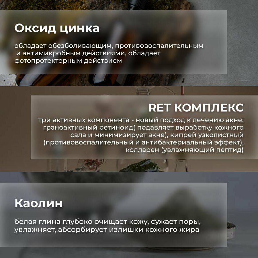Состав: Ret комплекс, сульфат натрия, оксид цинка, каолин, масло чайного дерева, витамины F и Е