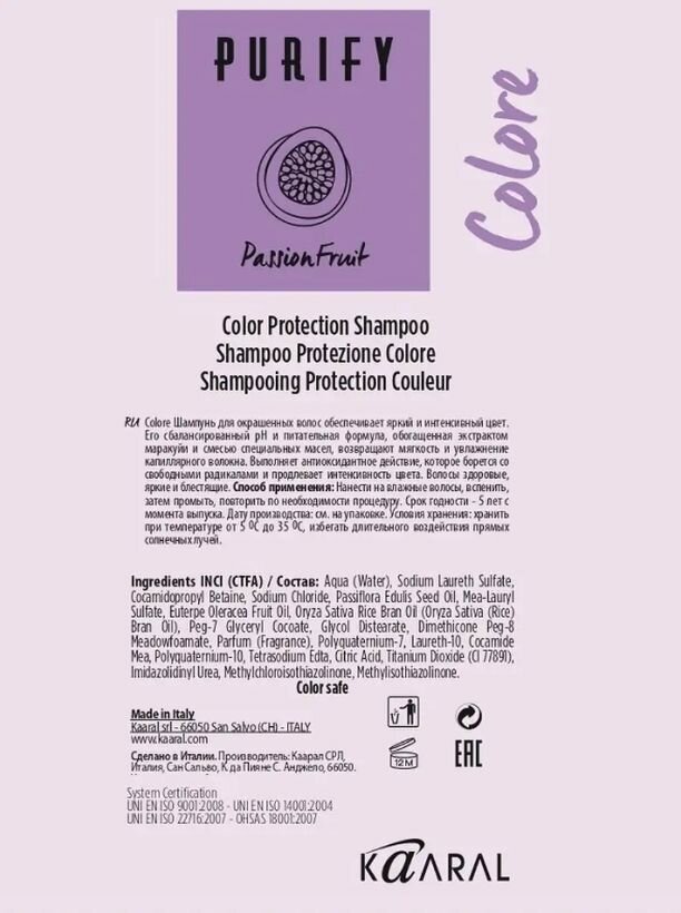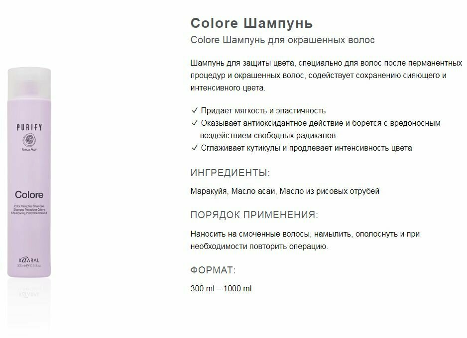 | Назначение | Антиоксидантный уход, Выравнивание поверхности волоса, Естественный блеск и сияние, Защита и сохранение яркости цвета окрашенных волос, Легкое расчесывание, Мягкость волос, Очищение волос и кожи головы, Увлажнение волос |