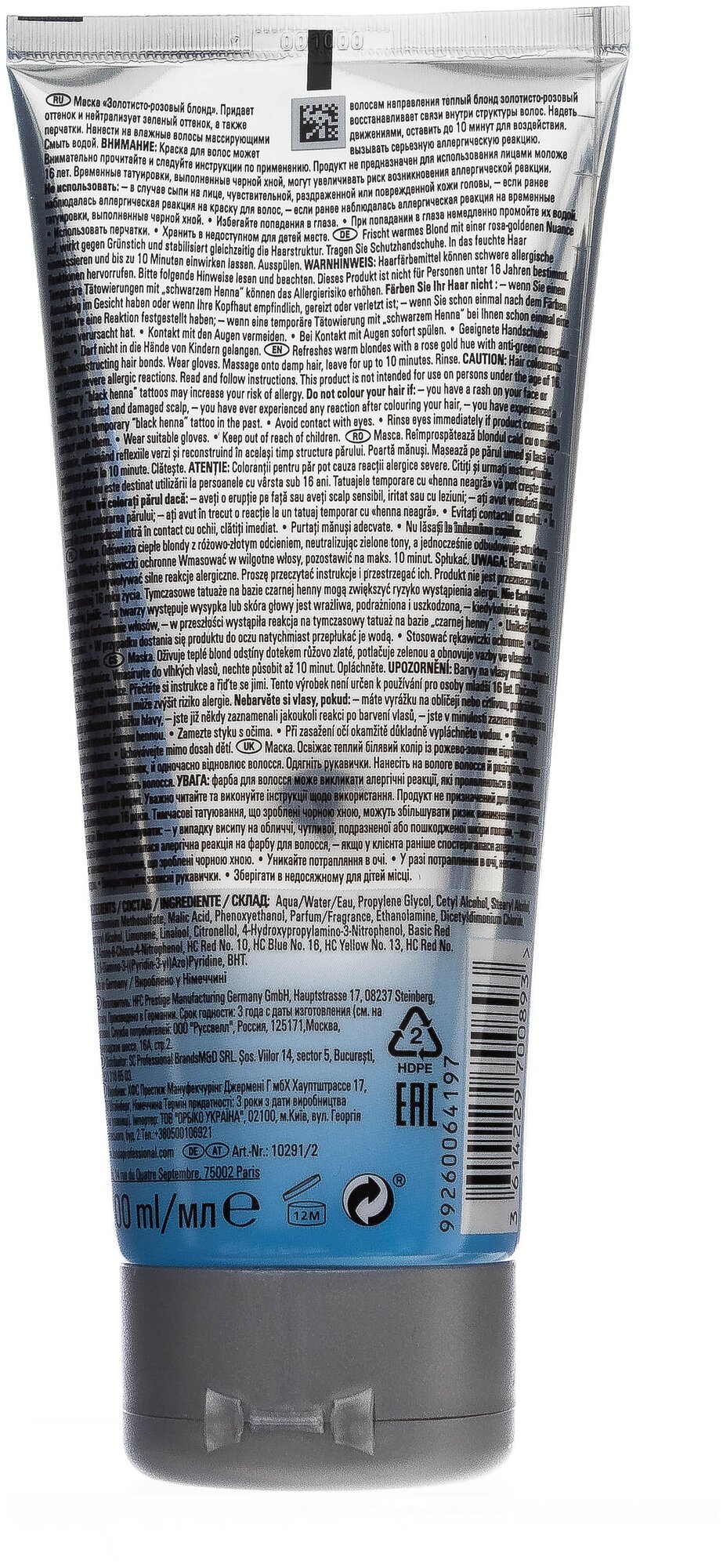 | Состав | Aqua/Water/Eau, Propylene Glycol, Cetyl Alcohol, Stearyl Alcohol, Behentrimonium Methosulfate, Malic Acid, Phenoxyethanol, Parfum/Fragrance, Ethanolamine, Dicetyldimonium Chloride, Isopropyl Alcohol, Limonene, Linalool, Citronellol, 4-Hydroxypropylamino-3-Nitrophenol, Basic Red 76, 2-Amino-6-Chloro-4-Nitrophenol, HC Red No. 10,HC Blue No. 16, HC Yellow No. 13, HC Red No. 11, 2,6-Diamino-3-((Pyridin-3-yl)Azo)Pyridine, BHT |