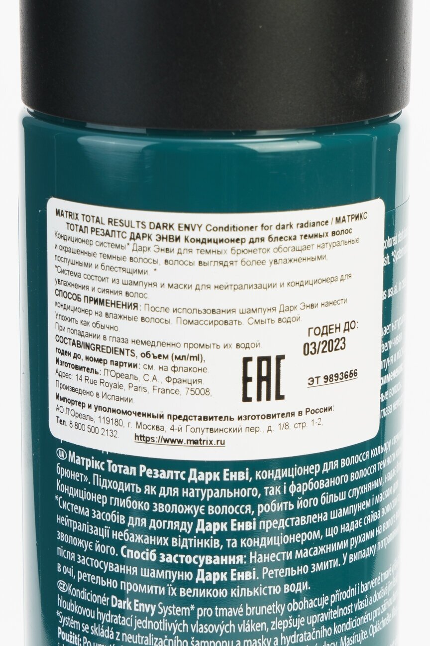 | Способ применения | Нанесите на влажные волосы после мытья шампунем. Помассируйте, оставьте на 1-2 минуты, смойте водой. Уложите волосы как обычно. При попадании в глаза немедленно промыть их водой. Рекомендуется использовать в комплексе с продуктами гаммы Total results Dark Envy. |