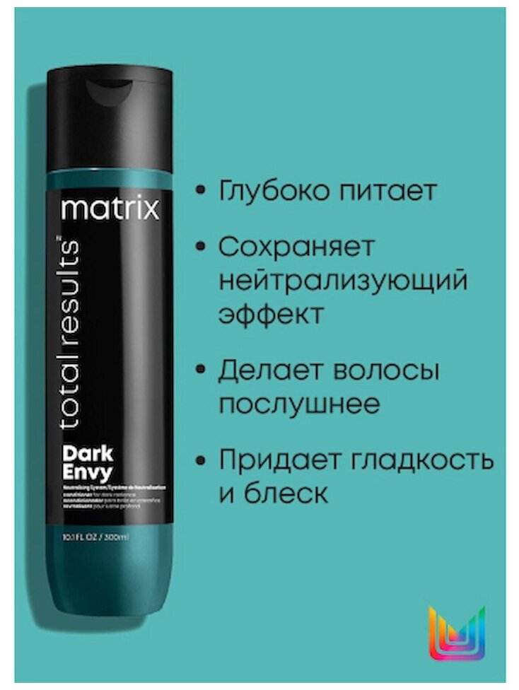 Кондиционер Total Results Dark Envy восстанавливает и обогащает окрашенные и натуральные темные волосы, дисциплинирует и увлажняет их. Средство убирает красные тона за счет универсальных пигментов в составе, придавая прядям глубокий холодный оттенок, блеск и сияние. А аромат цитрусовых нот, жасмина и кедра создает приятную спа-атсмосферу.
