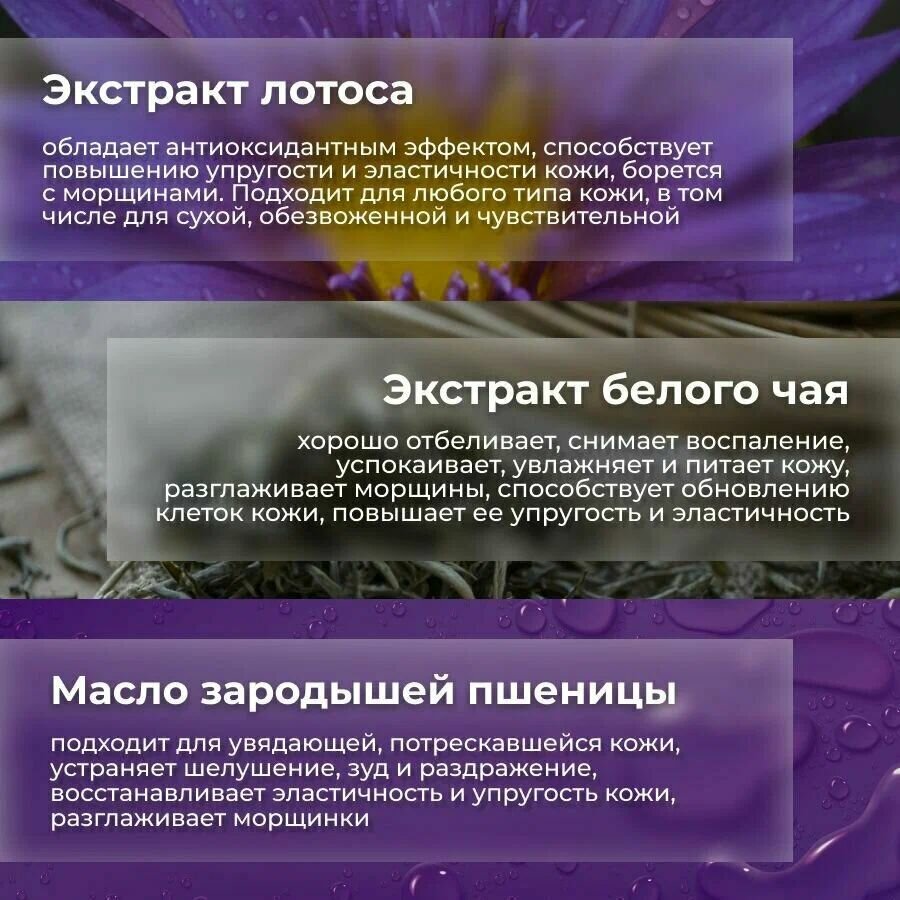 - экстракт лотоса - смягчает кожу, придает эластичность. Содержит в составе большое количество биофлаваноидов, обладающих мощным антиоксидантным действием