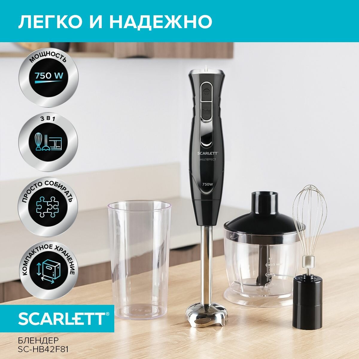 | Прочие свойства и особенности | Погружной блендер Scarlett SC-HB42F81 – идеальный прибор для измельчения и смешивания продуктов, а также для взбивания белков, кремов., , Блендер оснащён измельчителем, оптимальным объемом 0,6 л., , Модель работает в 20 скоростных режимах и Вы можете выбирать необходимый для решения любой кулинарной задачи. А в особенно сложных случаях просто воспользуйтесь кнопкой Turbo режима., , Погружная часть блендера изготовлена из нержавеющей стали марки Steel Pro, которая отлично подходит для приготовления блюд любой температуры. Рукоятка блендера имеет эргономичную форму, благодаря которой Ваша рука не устанет даже при длительном использовании., , «Нога» блендера оснащена ножом MULTIEFFECT с двумя укороченными лезвиями для увеличения режущей силы., венчики для взбивания, нож для измельчителя |