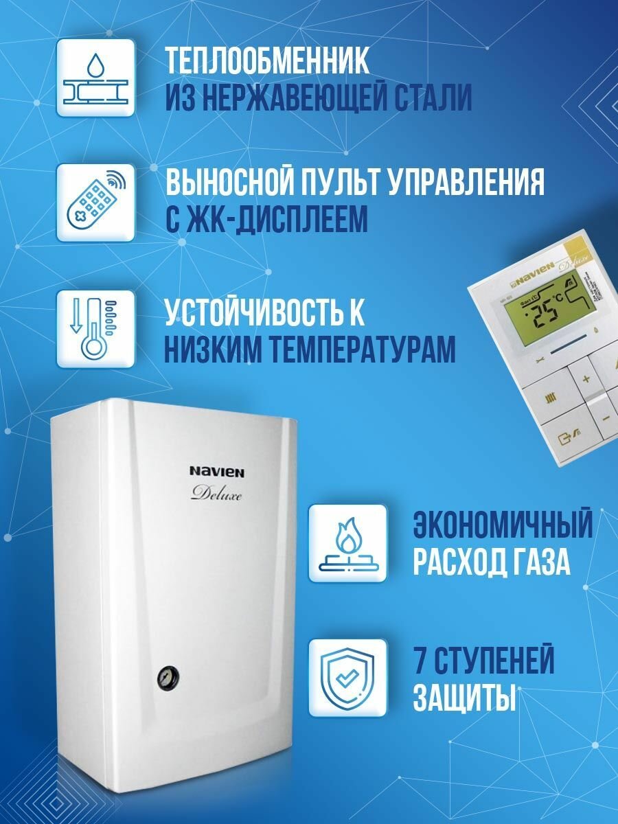Navien (Навьен) является настенным газовым котлом, который станет отличным выбором для создания системы водяного отопления и ГВС в доме небольшой площади. Поскольку камера сгорания в данной модели имеет закрытую конструкцию, то агрегат может быть установлен в жилом помещении без риска попадания продуктов сгорания в комнату или снижения уровня кислорода в воздухе помещения.