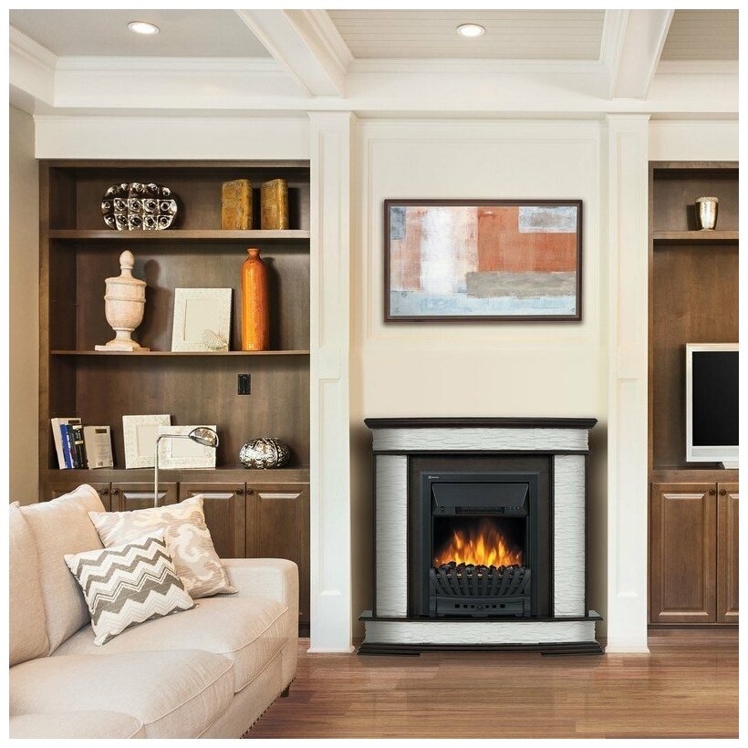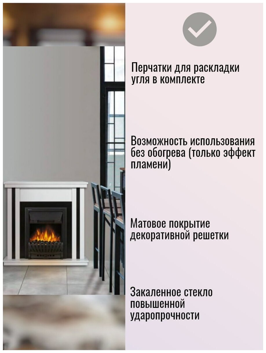 | Прочие особенности и свойства | Реалистичный эффект пламени Real Fire Perfect,Мощность обогрева 2000/1000 Вт,Возможность использования без обогрева (только эффект пламени),Декоративное топливо:натуральный уголь+ перчатки для раскладки угля в комплекте,Опция «Звук потрескивания дров» • Регулировка громкости звука «потрескивания дров» • Регулировка яркости пламени,Корпус не нагревается в процессе работы |