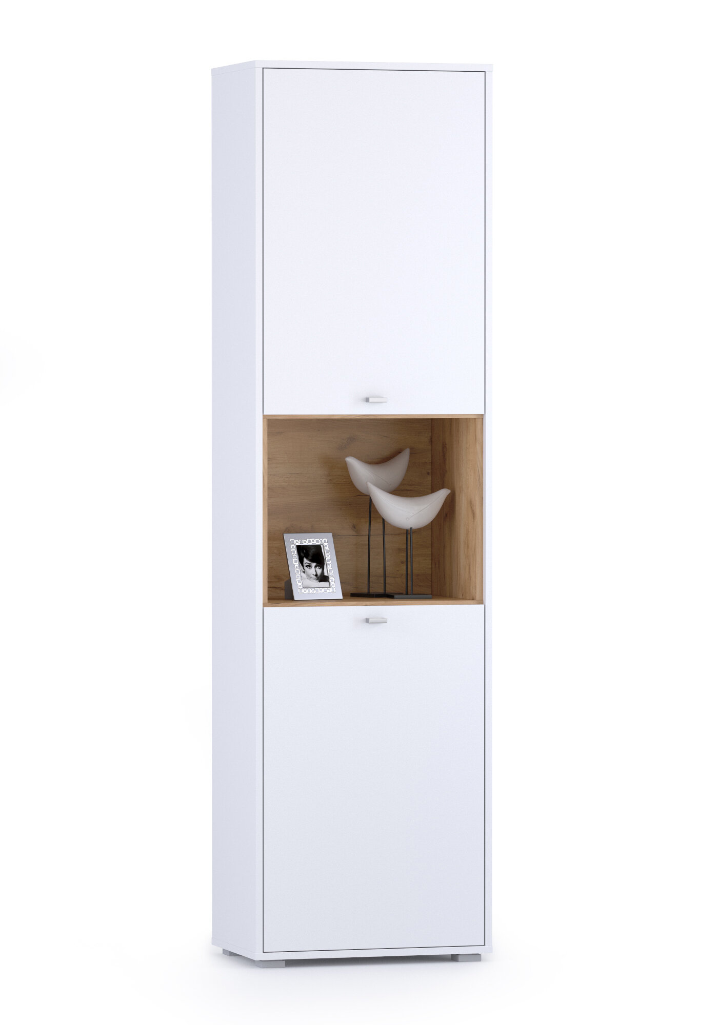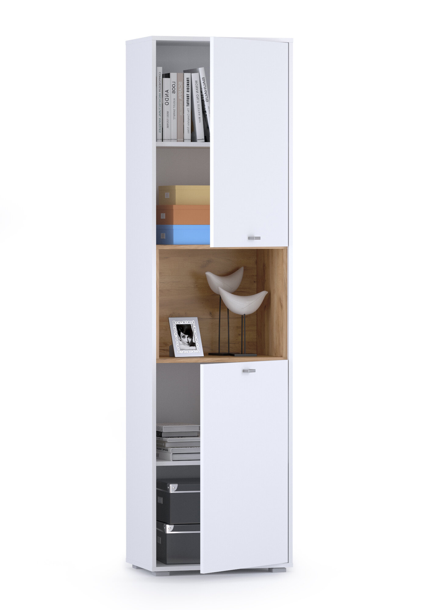 Пенал для гостиной Бэль. Цвет дуб крафт золотой/белый премиум.Размер (ШхГхВ) 55х36,6х200 см.Элегантность белоснежного пенала, стильно дополнена фактурной отделкой открытой ниши.За распашными дверками по две полки.Универсальная сборка фасада пенала для гостиной Бэл расширяет варианты интересных мебельных комбинаций.Пенал для гостиной Бэль - модуль из набора мебели для гостиной Бэль.