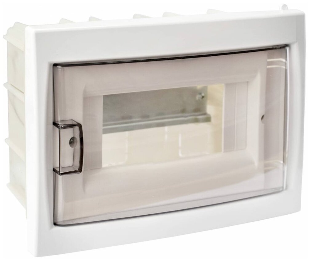 не плохой пластиковый бокс для электрики. Встраиваемый. 8 модулей. Нулевая шина в комплекте. Заземляющей шины в комплекте нет, но есть под нее место с креплением. Пластик белый, прочный. В задней части есть много вариантов вывода проводов через вырезаемые вставки. Внутри есть металлическая планка для крепления оборудования