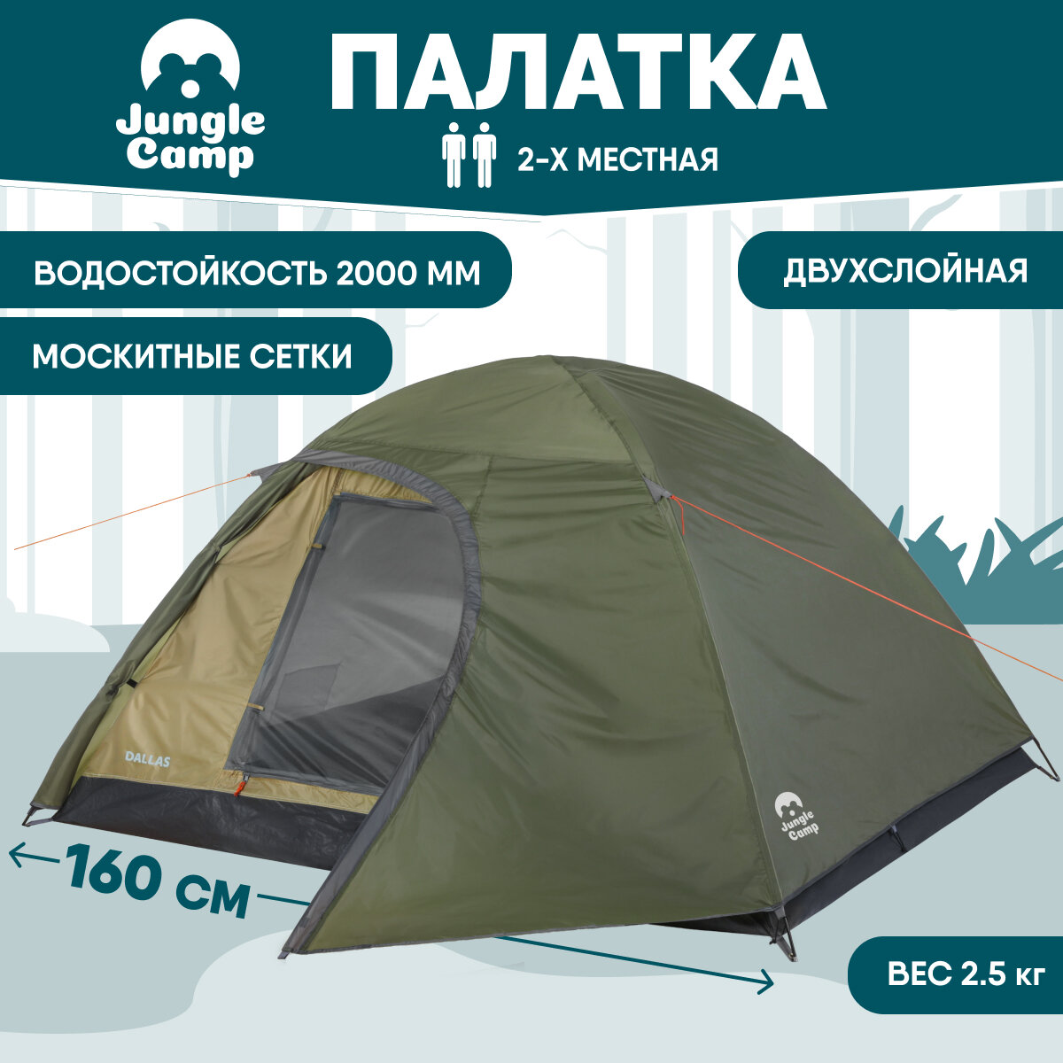 Двухместная палатка с небольшим тамбуром Jungle Camp Dallas 2 отлично подойдет для выездов на природу, рыбалки с ночевкой, походов выходного дня. Это самая бюджетная, не в ущерб техническим характеристикам, модель среди двухслойных палаток. Внешний тент с пропиткой PU водостойкостью 2000 мм и проклеенные швы надежно защищают от дождя и ветра. Внутренняя палатка выполнена из «дышащего» полиэстера, что препятствует оседанию конденсата на стенках спального помещения. Противомоскитная сетка в полный размер двери и вентиляционное окно на задней стенке палатки обеспечивают хорошую вентиляцию и препятствуют проникновению насекомых. Удобный тамбур позволяет разместить рюкзаки и обувь. Палатка легкая в сборке. Для организации пространства внутри палатки предусмотрены карманы для мелочей, крючок для подвешивания фонаря.