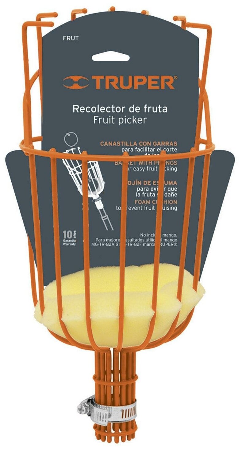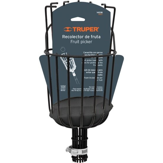 Плодосборник изготовлен из стали, легкий, безопасный и маневренный. Корзина с когтями для удобной подрезки фруктов. Подушка из пеноматериала для предотвращения повреждения собираемых плодов. Регулируемый зажим для фиксации на телескопической ручке. Диаметр: 150 мм.Длина: 330 мм.Размер зажима для черенка: 38 мм.