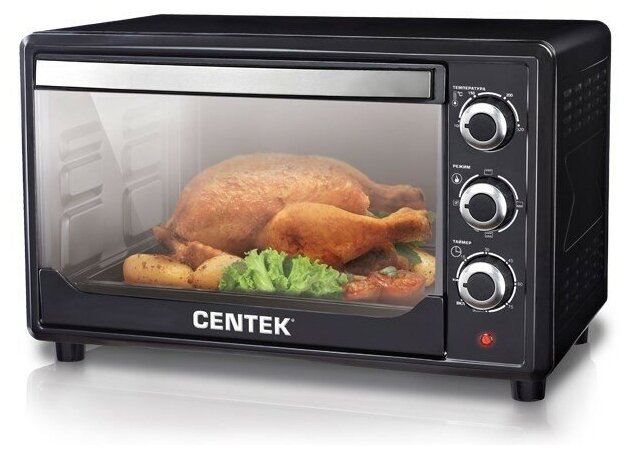 Centek CT-1530-36 представлена в черном корпусе. Конструкция модели предполагает наличие откидной дверцы, для открывания которой используется удобная ручка. Для управления функциями печи справа от дверцы размещены поворотные переключатели, позволяющие изменять режимы работы, температуру, настраивать таймер. Благодаря наличию таймера устройство поддерживает автоотключение, что позволит не находиться постоянно рядом с электропечью.