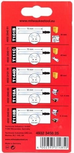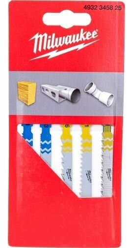 Полотна для лобзика по дереву и металлу, 5 шт. Milwaukee имеют Т-образный хвостовик.В набор входят полотна:4932213116 для быстрого реза дерева толщиной до 50 мм;