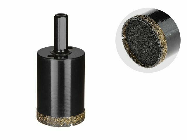 Для работы лучше всего использовать аккумуляторную дрель, сочетающую высокий крутящий момент и невысокие обороты. Рекомендуемая частота вращения от 350 до 500 об/мин. Обязательное охлаждение водой. Рекомендуется использовать кондуктор для предотвращения проскальзывания при начальном засверливании.