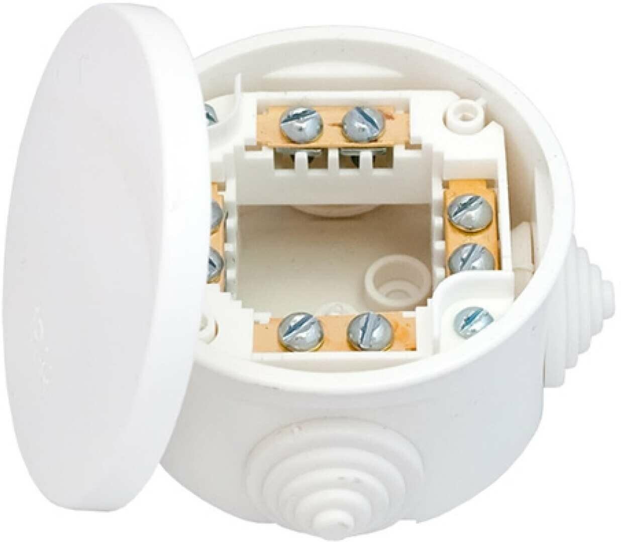 Коробка для разводки проводов с контактными зажимами (4 группы по 2шт.), откр.уст., 4 каб.ввода, полиамид, огнест. - 850°С, IP44, УХЛ4, габ.разм.: O87х43 мм, уст.разм.: 20х20±0,3мм, сеч.пров.: 2,5 мм2