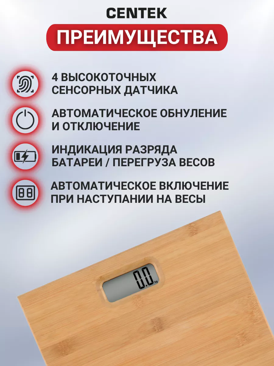 Весы Centek – удобные и надежные весы для тех, кто тщательно следит за своим весом. Платформа из натурального бамбука прочная, красивая и приятная на ощупь. Размер платформы 28х28 см. Высокая точность замеров обусловлена 4 сенсорными датчиками. Результаты замеров отображаются на большом удобном LCD-дисплее размером 65х28 мм. Автоматическое включение и выключение, индикаторы разряда батареи и перегруза весов. Батарея 2×1,5 В ААА (в комплекте). Грузоподъемность до 180 кг.