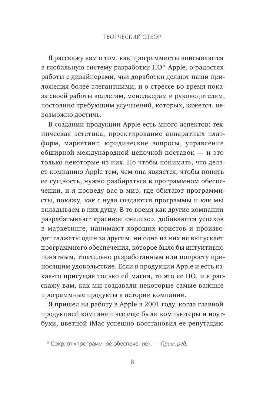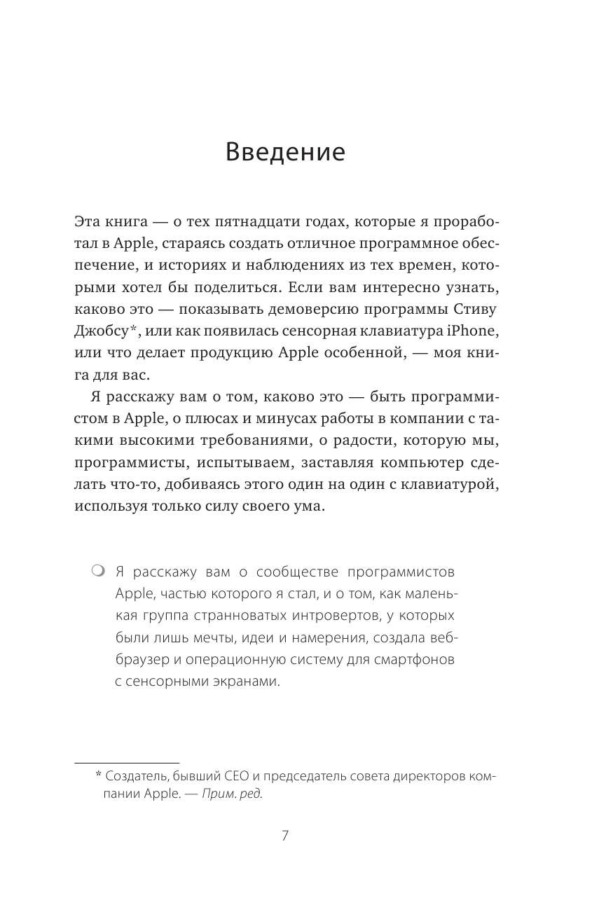 Книга описывает процесс создания продуктов Apple с позиции разработчика программного обеспечения и предоставляет возможность заглянуть во «внутреннюю кухню» компании Apple.