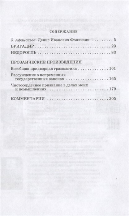 В книгу вошли две знаменитые комедии Д. И. Фонвизина "Бригадир" и "Недоросль", а также прозаические произведения: "Всеобщая придворная грамматика", "Рассуждение о непременных государственных законах" и "Чистосердечное признание в делах моих и помышлениях". Для старшего школьного возраста.