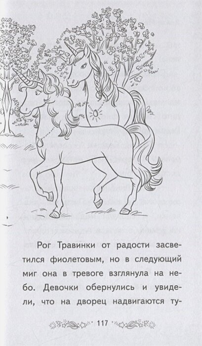 Книга небольшого формата, чуть больше А5, хороший офсет. Текст крупный, хорош для самостоятельного чтения. Рисунки черно-белые, так и просятся, чтобы их раскрасили, очень приятные. Рисунков достаточно много, есть даже карты дома и местности и в нашем мире, а Долине Единорогов. -