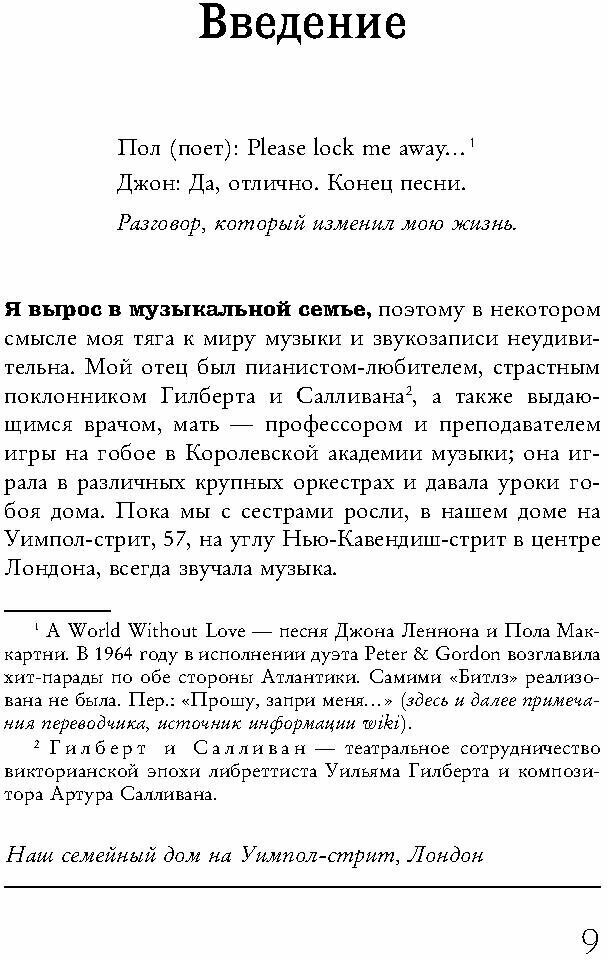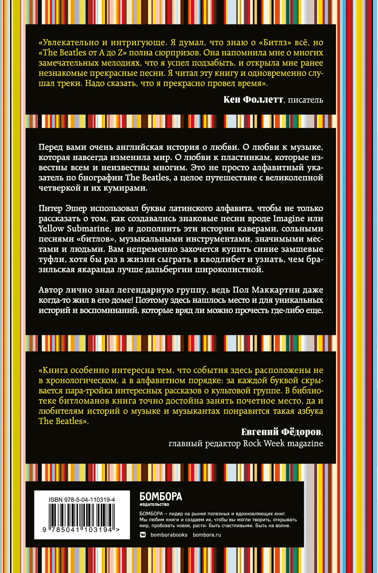 Еще одна книга о знаменитых Битлах, на этот раз от музыканта, продюсера и менеджера (в том числе и в Apple Records) Питера Эшера. Более того, Пол Маккартни встречался с его сестрой в 60-х, и жил вместе с его семьей пару лет в одном доме. Главы в этой книге разбиты по буквам алфавита, а на каждую буквы приходится несколько историй, которые как-то связаны с группой: песни Битлов, их сольные проекты, другие музыканты, фильмы, альбомы и так далее. В этом, по сути, и вся соль книги, но мне лично при прочтении, такое решение не показалось удачным. Получилось немного сумбурно и увлекательным такие переходы чтение не делают. Довольно много сносок и пояснений, поэтому для комфортного понимания нужно хорошее знание не только песен и альбомов группы, но и других музыкантов, теории музыки и т.д. Уникальных историй от автора о Битлз в книге не так и много, в основном он добавляет собственное впечатление, либо общеизвестные факты. В целом, книга хорошая и стоит внимания, но скорее для тех, кто хорошо ориентируется в творчестве группы и музыкальном мире. В качестве первой книги о Битлз не подойдет. Качество издания отличное, нареканий нет вообще.