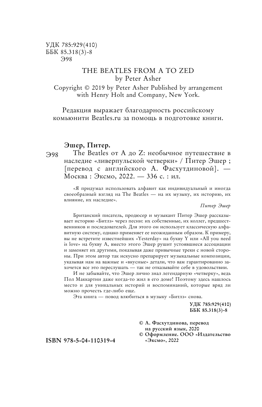 The Beatles от A до Z: необычное путешествие в наследие «ливерпульской четверки» (Эшер Питер); ООО "Издательство "Эксмо", 2020