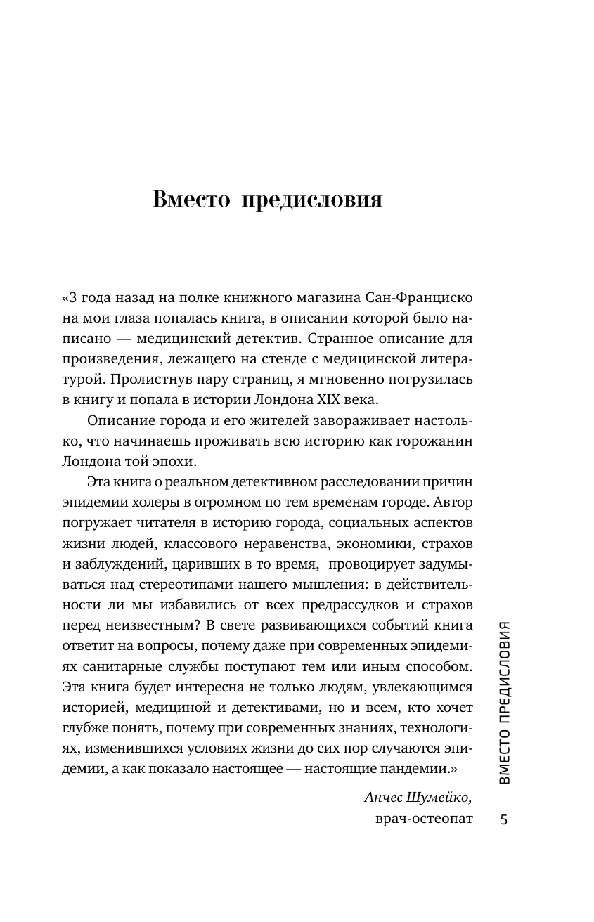 Вспышка холеры в Лондоне 1854 года (о ней эта книга) – привела к усовершенствованию систем водоснабжения и дезинфекции.