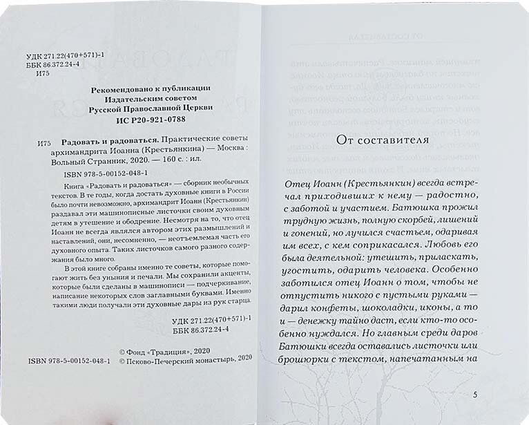 Книга "Радовать и радоваться" - сборник необычных текстов. В те годы, когда достать духовные книги в России было почти невозможно, архимандрит Иоанн (Крестьянкин) раздавал эти машинописные листочки своим духовным детям в утешение и ободрение. Несмотря на то, что отец Иоанн не всегда являлся автором этих размышлений и наставлений, они, несомненно, - неотъемлемая часть его духовного опыта. Таких листочков самого разного содержания было много.