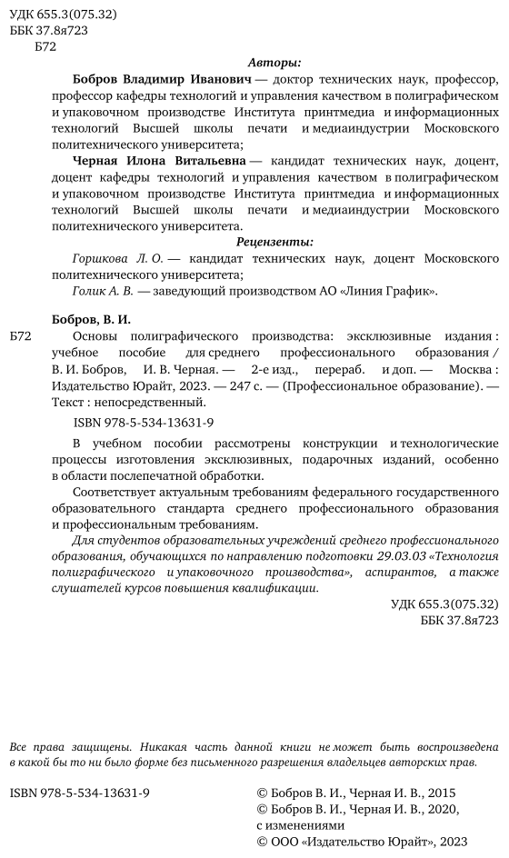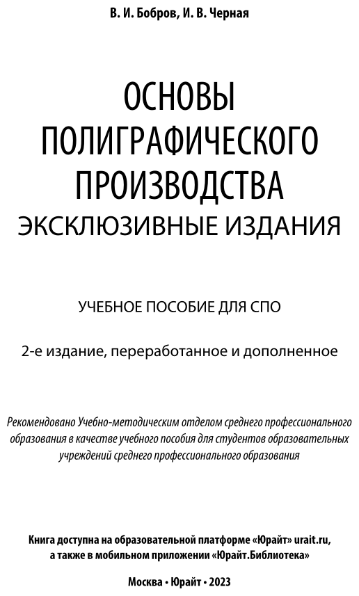 Основы полиграфического производства: эксклюзивные издания 2-е изд. пер. и доп. Учебное пособие для СПО (Бобров Владимир Иванович; Черная Ирина Владимировна); ЮРАЙТ, 2022