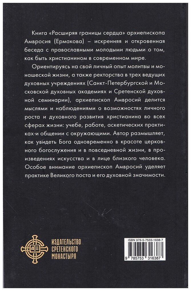 В книге "Расширяя границы сердца" архиепископ Верейский Амвросий (Ермаков), наместник Сретенского монастыря и ректор Сретенской духовной семинарии, откровенно рассказывает о своем преподавательском и монашеском опыте, о различных аспектах духовной и интеллектуальной жизни; являет глубокий христианский взгляд на процесс образования и те возможности духовного роста, которые оно несет в себе; дает много рекомендаций верующему молодому человеку о том, как сделать процесс учебы процессом постоянного внутреннего обогащения, научиться внимательности и собранности. Автор рассуждает о Великом посте и его значимости, о любви и прощении как его главных составляющих, о встрече с Богом в окружающих нас людях, предлагает практические советы собирающимся принять монашество.
