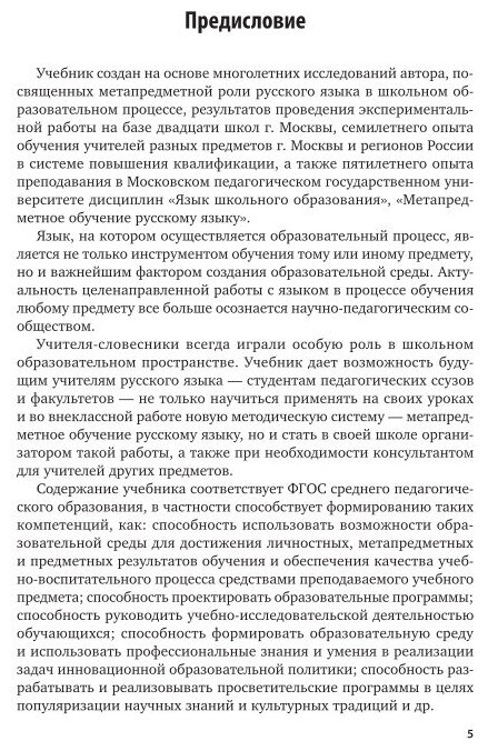 В учебнике представлены основы нового направления в методике преподавания русского языка. Курс дает будущим учителям-словесникам возможность освоить систему работы, нацеленной на формирование в школе такой образовательной среды, в которой все участники учебного процесса уделяют специальное внимание языковым аспектам обучения. Представленная в учебнике методика позволяет реализовать в школе обучение русскому языку, которое охватывает уроки не только непосредственно этого, но и других предметов, а также внеклассную работу. Курс содержит более 50 практических заданий, выполнение которых поможет учителю-словеснику не только осуществлять метапредметное обучение языку на своих уроках, но и стать организатором такой работы в педагогическом коллективе, быть консультантом для учителей других предметов. Соответствует актуальным требованиям Федерального государственного образовательного стандарта среднего профессионального образования и профессиональным требованиям. Для студентов педагогических ссузов; может использоваться для обеспечения программ повышения квалификации, профессиональной переподготовки, а также для самостоятельной подготовки учителей русского языка и других предметов.