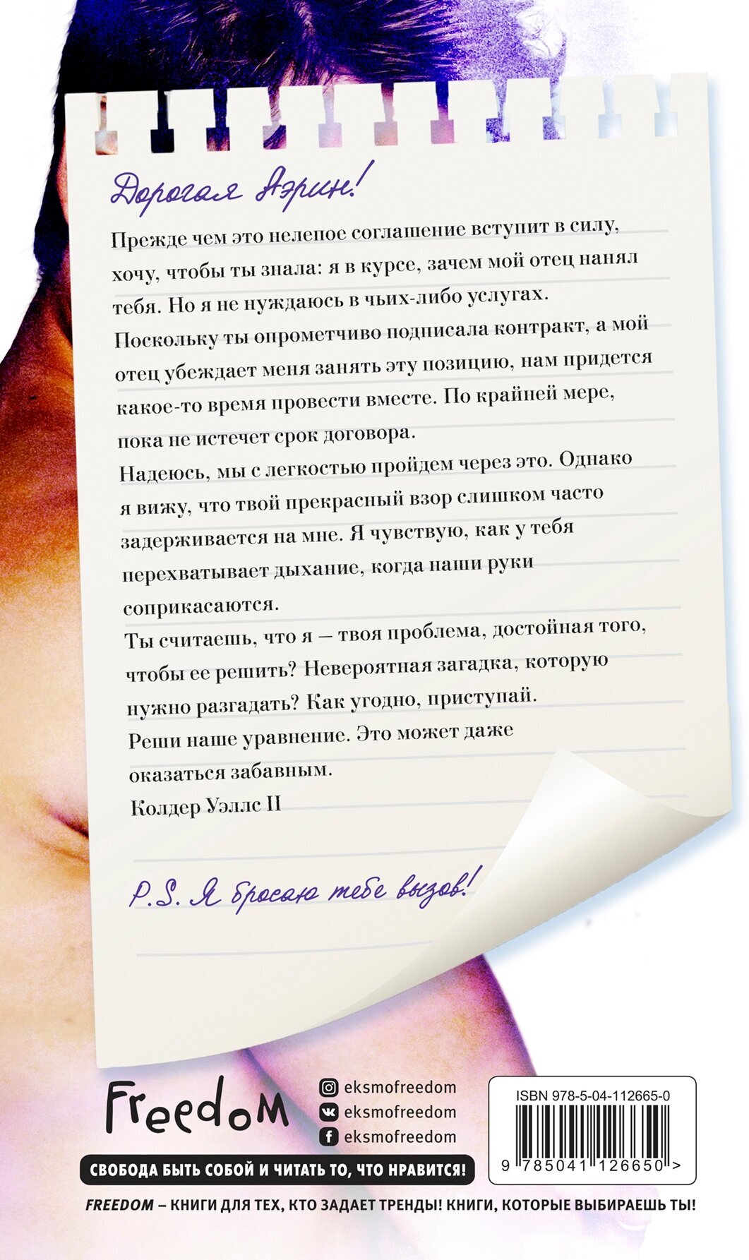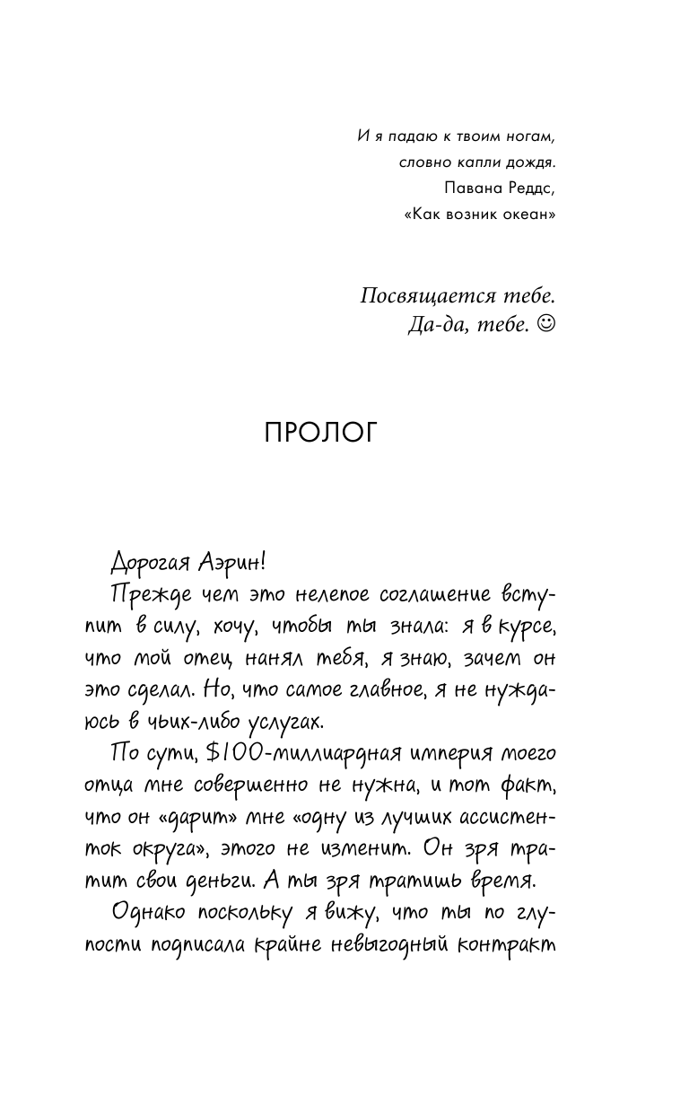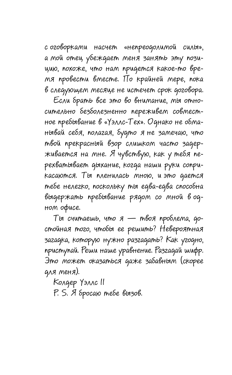 От автора бестселлеров "Wall Street Journal" и Amazon. comДорогая Аэрин!Прежде чем это нелепое соглашение вступит в силу, хочу, чтобы ты знала: я в курсе, зачем мой отец нанял тебя. Но я не нуждаюсь в чьих-либо услугах.Поскольку ты опрометчиво подписала контракт, а мой отец убеждает меня занять эту позицию, нам придется какое-то время провести вместе. По крайней мере, пока не истечет срок договора.Надеюсь, мы с легкостью пройдем через это. Однако я вижу, что твой прекрасный взор слишком часто задерживается на мне. Я чувствую, как у тебя перехватывает дыхание, когда наши руки соприкасаются. Ты считаешь, что я – твоя проблема, достойная того, чтобы ее решить? Невероятная загадка, которую нужно разгадать? Как угодно, приступай. Реши наше уравнение. Это может даже оказаться забавным.Колдер Уэллс IIP. S. Я бросаю тебе вызов!