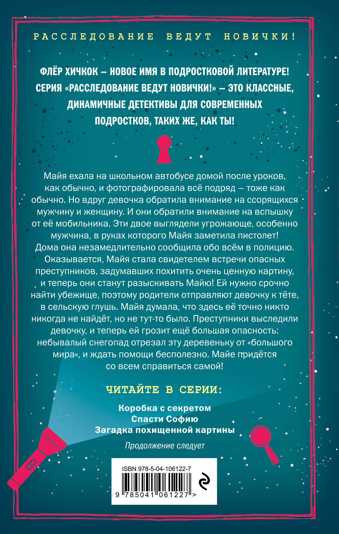 Майя ехала на школьном автобусе домой после уроков, как обычно, и фотографировала все подряд, - тоже, как обычно. Но вдруг девочка обратила внимание на ссорящихся мужчину и женщину. И они обратили внимание на вспышку от ее мобильника. Эти двое выглядят угрожающе, особенно мужчина, в руках которого Майя заметила пистолет! Дома она незамедлительно сообщила обо всем в полицию. Оказывается, Майя стала свидетелем встречи опасных преступников, задумавших похитить очень ценную картину, и теперь они станут разыскивать Майю! Ей нужно срочно найти убежище, поэтому родители отправляют девочку к тете, в сельскую глушь. Здесь нет интернета, мобильник не ловит, повсюду грязь и скукотища. Майя думала, что здесь ее точно никто никогда не найдет, но не тут-то было. Преступники выследили девочку, и теперь ей грозит еще большая опасность: небывалый снегопад отрезал эту деревеньку от «большого мира», и ждать помощи бесполезно. Майе придется со всем справиться самой!