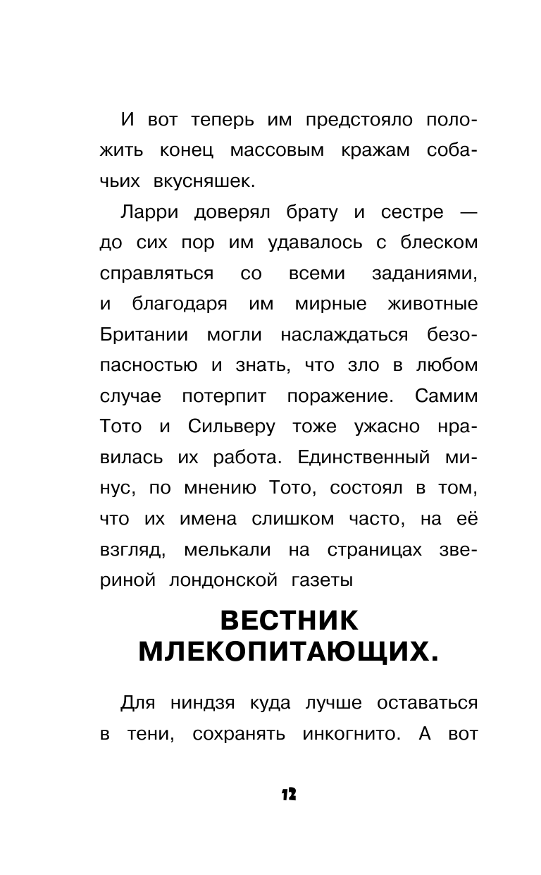 Это третья книга из серии книг про приключения слепой кошки-ниндзя Тото, её брата Сильвера и их друзей. Мы с дочерью очень любим эти книги: плотная белая бумага, крупный шрифт, динамичный сюжет. Есть слова, выделенные жирнее и крупнее, чем остальной текст. Моя пятилетняя дочь как раз учится читать, и очень любит сама читать эти фразы.