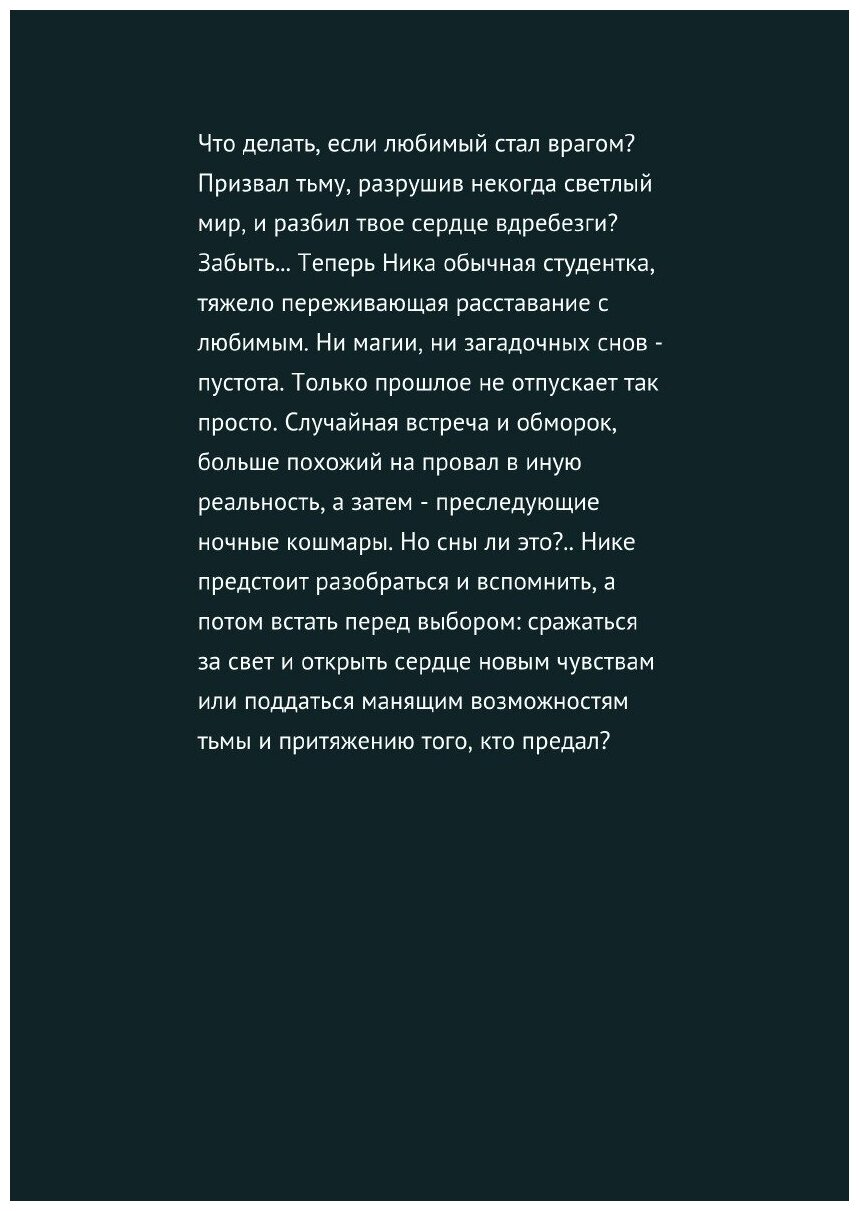 Что делать, если любимый стал врагом? Призвал тьму, разрушив некогда светлый мир, и разбил твое сердце вдребезги? Забыть… Теперь Ника обычная студентка, тяжело переживающая расставание с любимым. Ни магии, ни загадочных снов – пустота. Только прошлое не отпускает так просто. Случайная встреча и обморок, больше похожий на провал в иную реальность, а затем – преследующие ночные кошмары. Но сны ли это?.. Нике предстоит разобраться и вспомнить, а потом встать перед выбором: сражаться за свет и открыть сердце новым чувствам или поддаться манящим возможностям тьмы и притяжению того, кто предал?