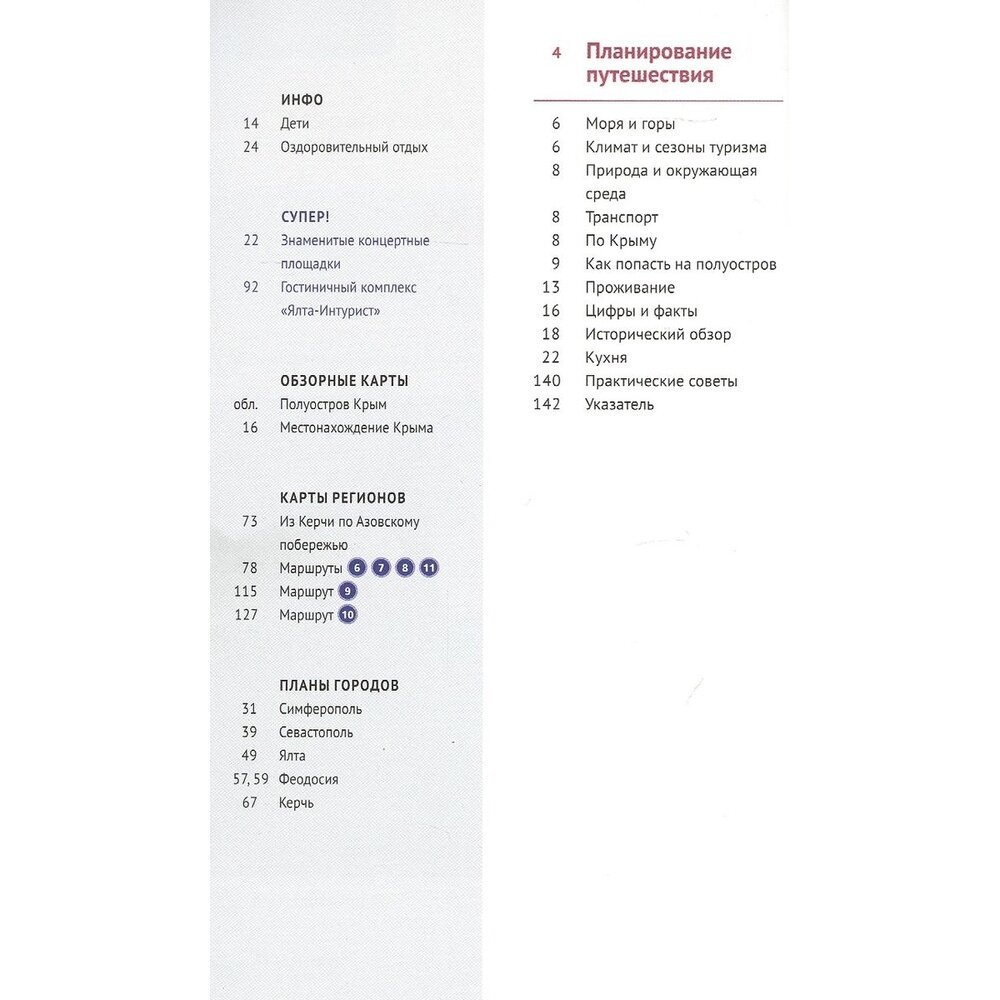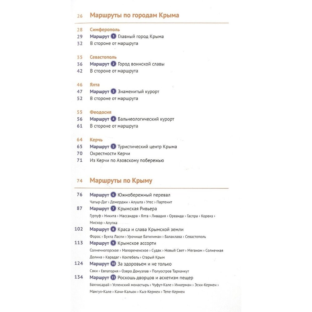 Помимо заявленных общих сведений, в книге дана подробная информация по следующим городам: Ялта, Алупка, Севастополь, Бахчисарай, Симферополь, Евпатория, Алушта, Судак, Феодосия, Керчь.