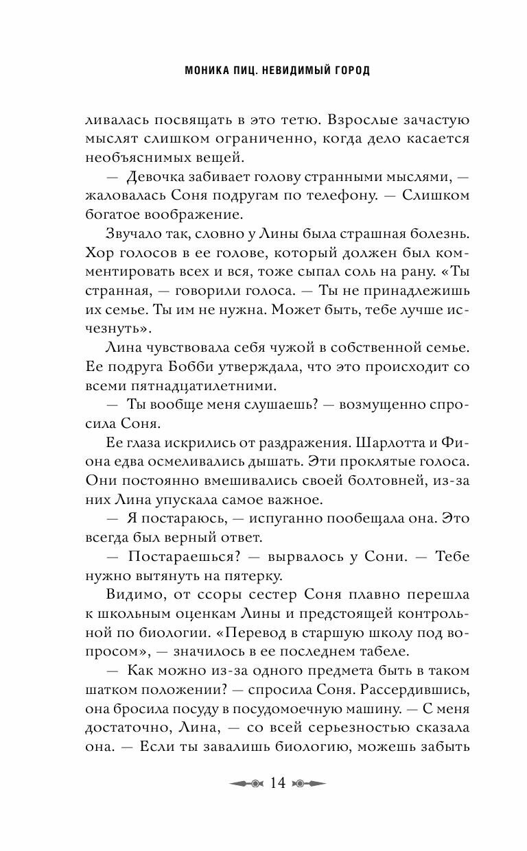 Жизнь 15-летней Лины полна трудностей: чужая семья, грозная учительница, безответная влюблённость. Но то, что намного хуже, - это разрозненные фрагменты прошлого, миллионы вопросов…Как именно погибли её родители? Что за таинственные часы с гравировкой её имени хранятся среди старых вещей? И кто этот симпатичный юноша с разноцветными глазами, который везде за ней следует? На все свои вопросы девушка найдет ответы в Невидимом городе - месте, где время не подчиняется земным законам. Теперь Лине предоставлен шанс изменить прошлое. Но без помощи Данте ей вряд ли обойтись, ведь на кону не только судьба её родителей, но и жизнь лучшей подруги Бобби…