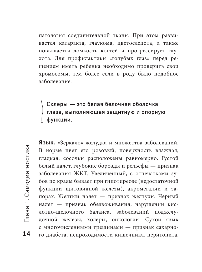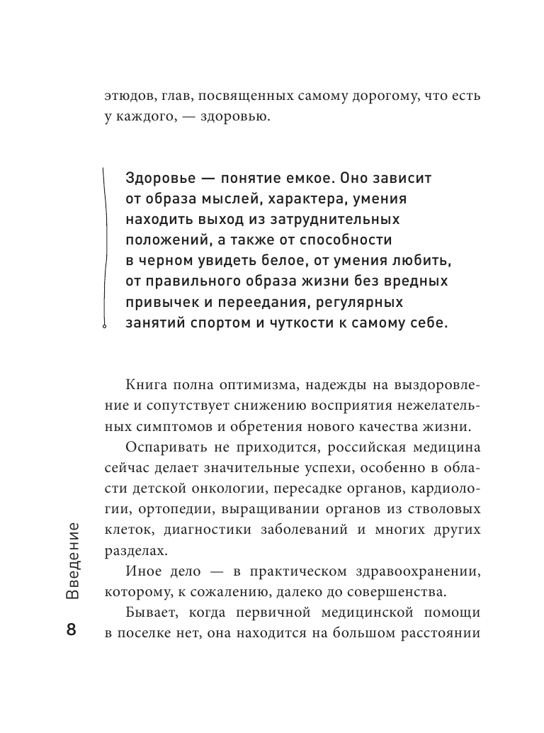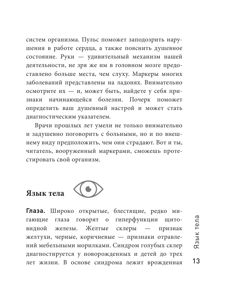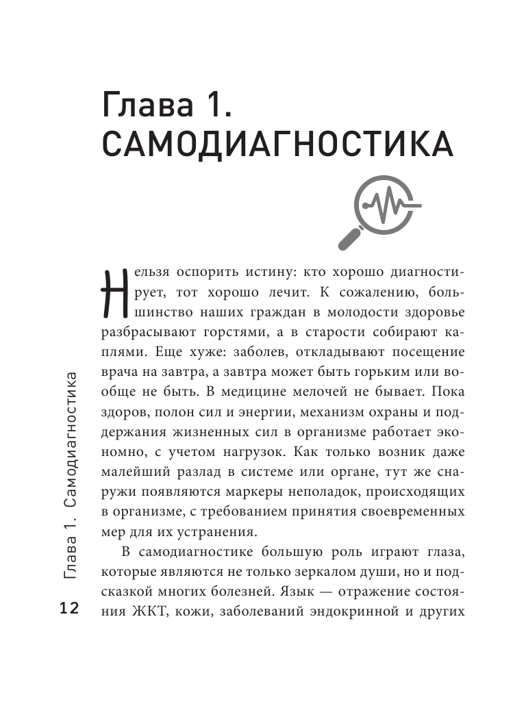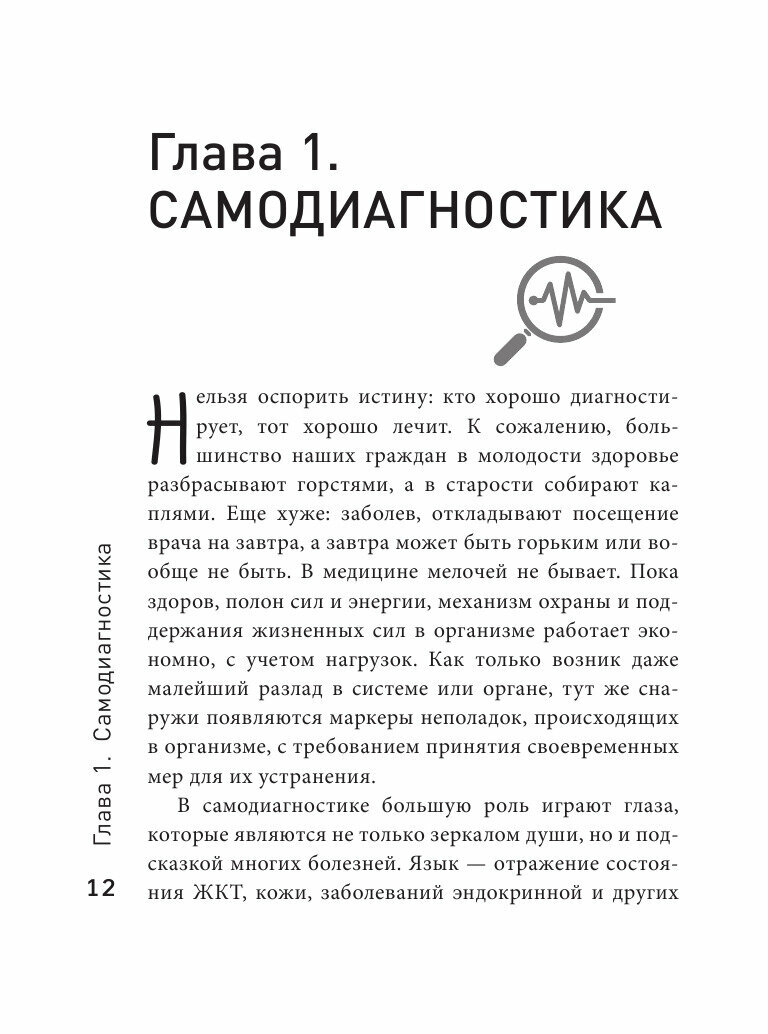 Книга интересна с разных сторон, и в-первую очередь с медицинской стороны, а во-вторую с научной и т.д. Книга написана достойно и доступно для любого читателя. Материал освещен последовательно и удобен в применении на практике. Здоровье важно! Поэтому эта книга очень хорошее поспорье для самодиагностики. А при внимательном прочтении можно найти методы и для самопомощи для себя и бликих. Книга, думаю будет являться отличным призентом для друзей.