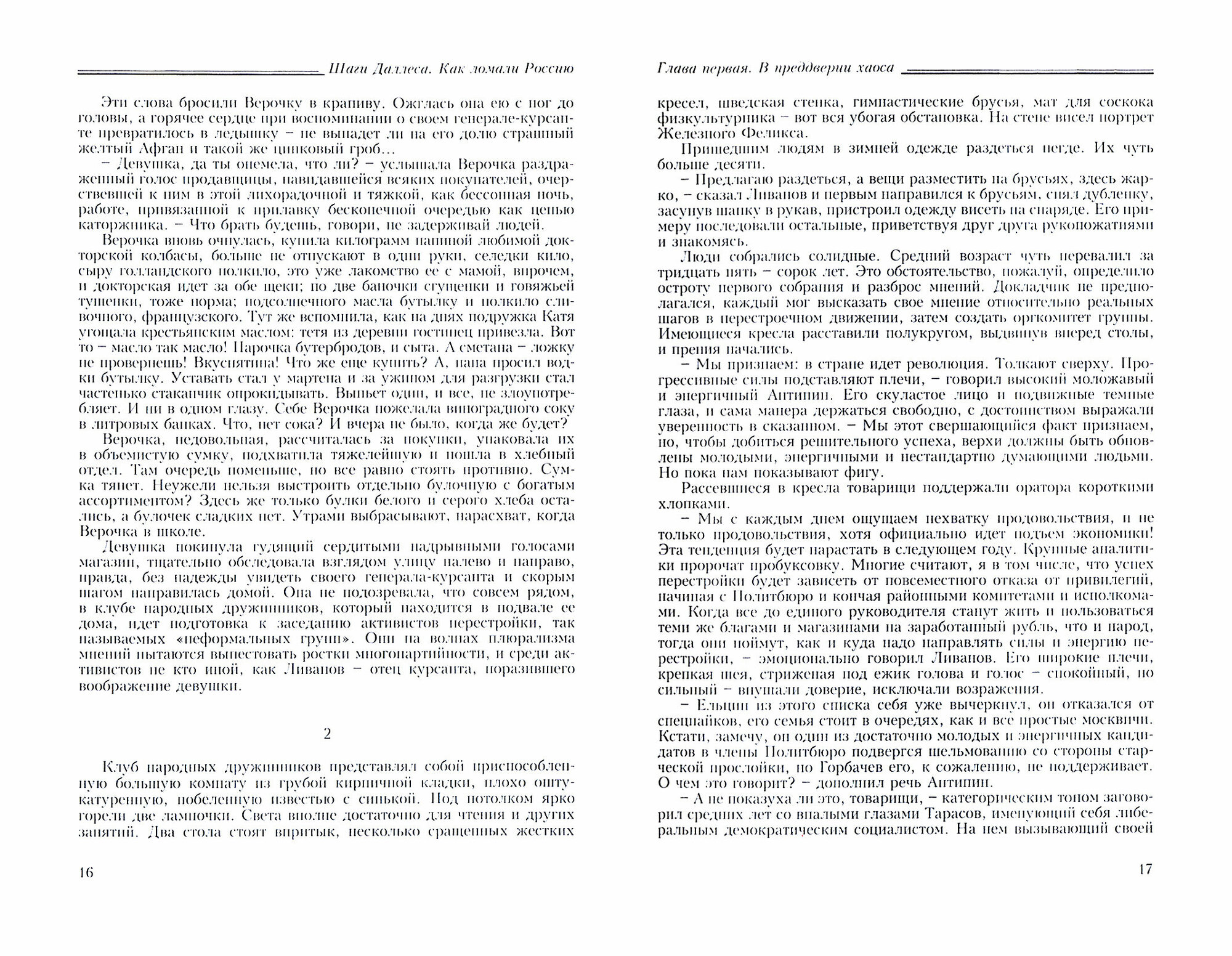 «Шаги Даллеса»… Потрясающее название романа писателя Владимира Нестеренко. С первых страниц, ошеломленная, сразу схватилась за ручку и стала выписывать те исторические факты, цифры, которые я не знала. Была в шоке от всего: и от революции, и от коллективизации, от Афгана, от Горбачева. В основном, общее положение дел мне было знакомо, но детали, переписка политических деятелей… И всё на основании архивных материалов. А чего уж я вообще не знала, вернее, слышала, но не верила – о роли мирового закулисья в бедах нашей России.
