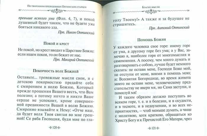 Купила вторую книгу, так как первую подарила своей приятельнице. Очень мудрая книга, в которой приведены высказывания Оптинских старцев по раличным жизненным ситуациям. В Оптиной пустыни просияли 14 старцев: Лев, Макарий, Моисей, Антоний, Иларион, Амвросий, Анатолий I, Исаакий I, Иосиф, Варсонофий, Анатолий II, Нектарий, Никон, Исаакий II. Самым известным является преподобный Амвросий Оптинский. Даже если вы никогда не были в Оптиной пустыни, вы скорее всего слышали или видели молитву Оптинских старцев. В ее чрезвычайно простых словах заключена глубочайшая философия жизни, которой старцы учили всех, кто приходил к ним за духовной помощью.