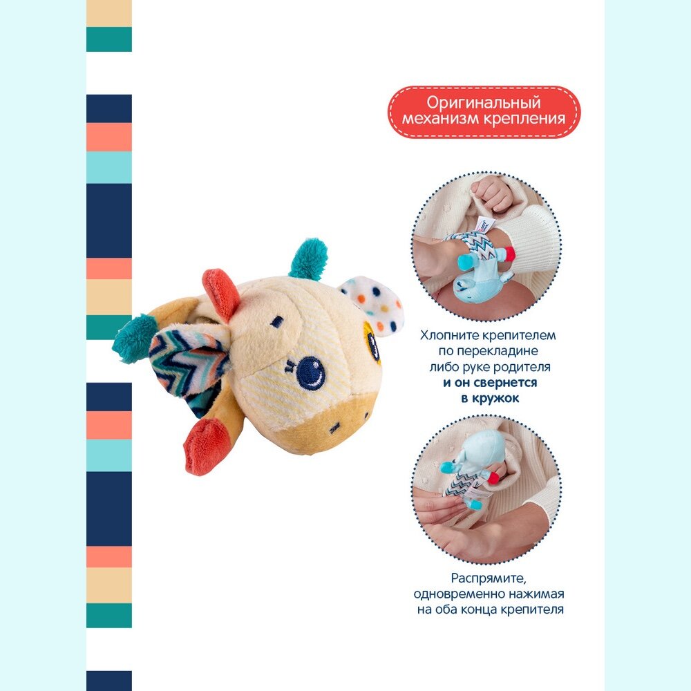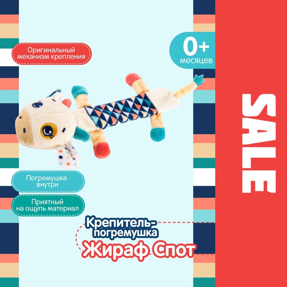 Крепитель Жираф Спот с туловищем - широкой полоске и хвостиком. Состоит из мягких материалов. Игрушку можно закреплять на запястье или прикреплять игрушку к коляске или кроватке.
