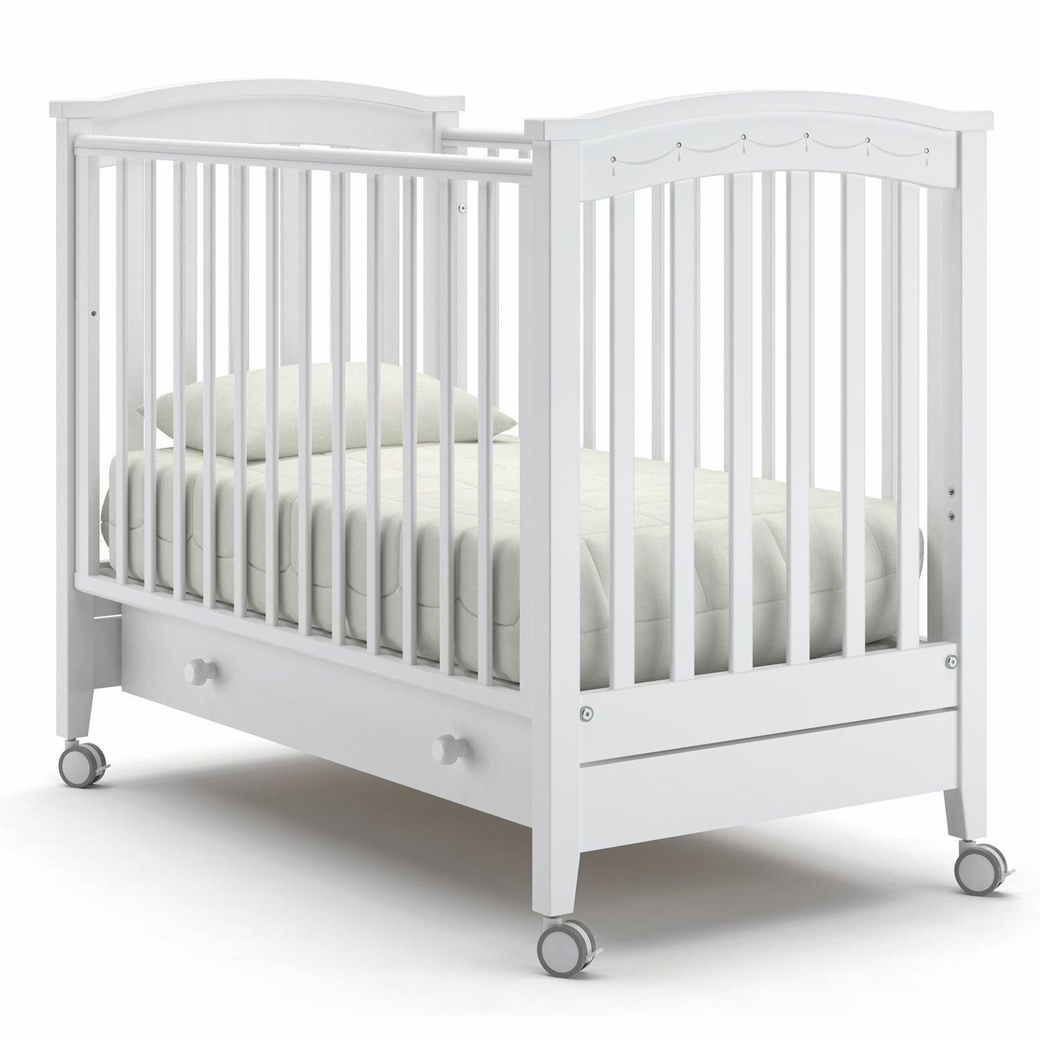 В нижней части кроватки находится ящик для хранения белья, который снабжен качественным выкатным механизмом. Кровать сделана из древесины бука, при изготовлении бельевого ящика использованы элементы из ЛДСП. Все материалы, эмалевое покрытие и фурнитура соответствуют европейским стандартам безопасности.