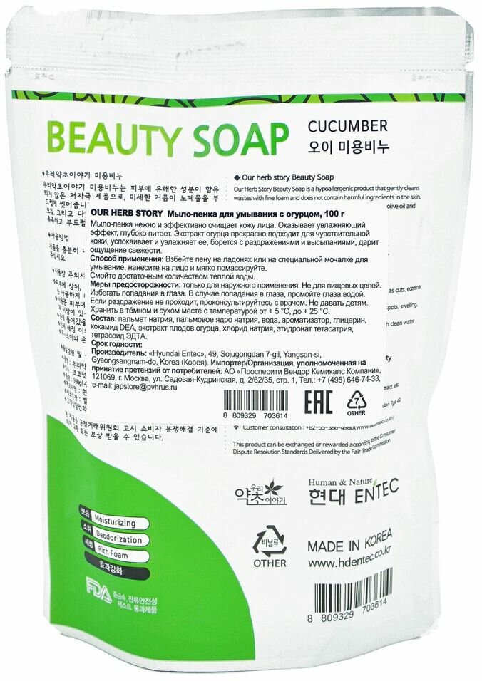 Korea - Товар Мыло-пенка для умывания с огурцом 100 г beauty soap cucumber our herb story Hyundai Entec KR (1173285)