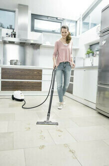 Пароочиститель SC5 самый мощный в своем классе.Возможность подключения парового утюга делает его более универсальным. Пароочиститель Керхер SC5 удаляет 99,99% микроорганизмов на твердых покрытиях без применения химических средств. Большой выбор аксессуаров к пароочистителю поможет справиться с любой задачей очистки. Парогенератор также оснащен насадкой для пола Comfort plus с гибким соединением, что делает уборку полов простой и удобной. Также замена салфетки для пола осуществляется бесконтактно. Функция VapoHydro удалит даже стойкие загрязнения за счет подачи горячей воды непосредственно на очищаемую поверхность. Вода для пароочистителя может пополняться без перерывов в работе благодаря съемному бачку. Также на корпусе парогенератора есть место для хранения кабеля, аксессуаров и парковочная позиция для коротких перерывов в уборке.