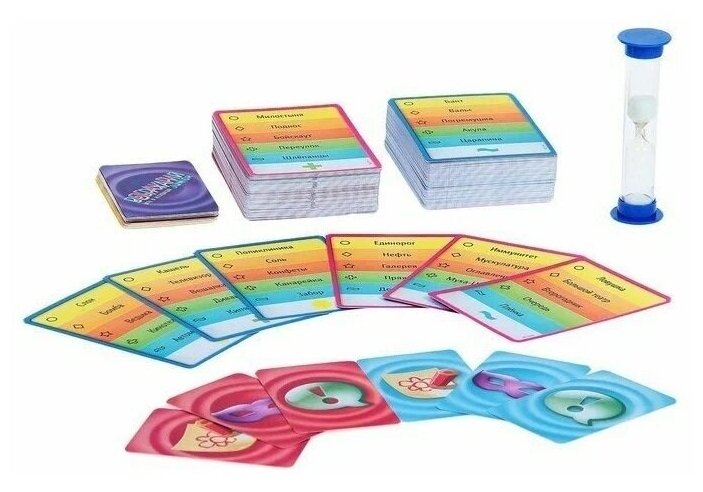 | Комплектация | 147 двусторонних карт заданий, 27 карт действия, песочные часы, правила игры. |