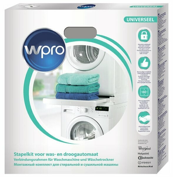Соединительный элемент Wpro УНИВЕРСАЛЕН, его характеристики обеспечивают высочайший уровень безопасности использования. Подходит к стиральным и сушильным машинам любых брендов, у которых размеры верхней поверхности составляют 60х60 см.