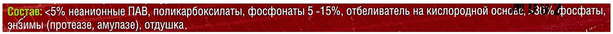 | Состав | менее 5 неанионные ПАВ, поликарбоксилаты, фосфонаты 5 -15, отбеливатель на кислородной основе 30 фосфаты, энзимы (протеазе, амулазе), отдушка |
