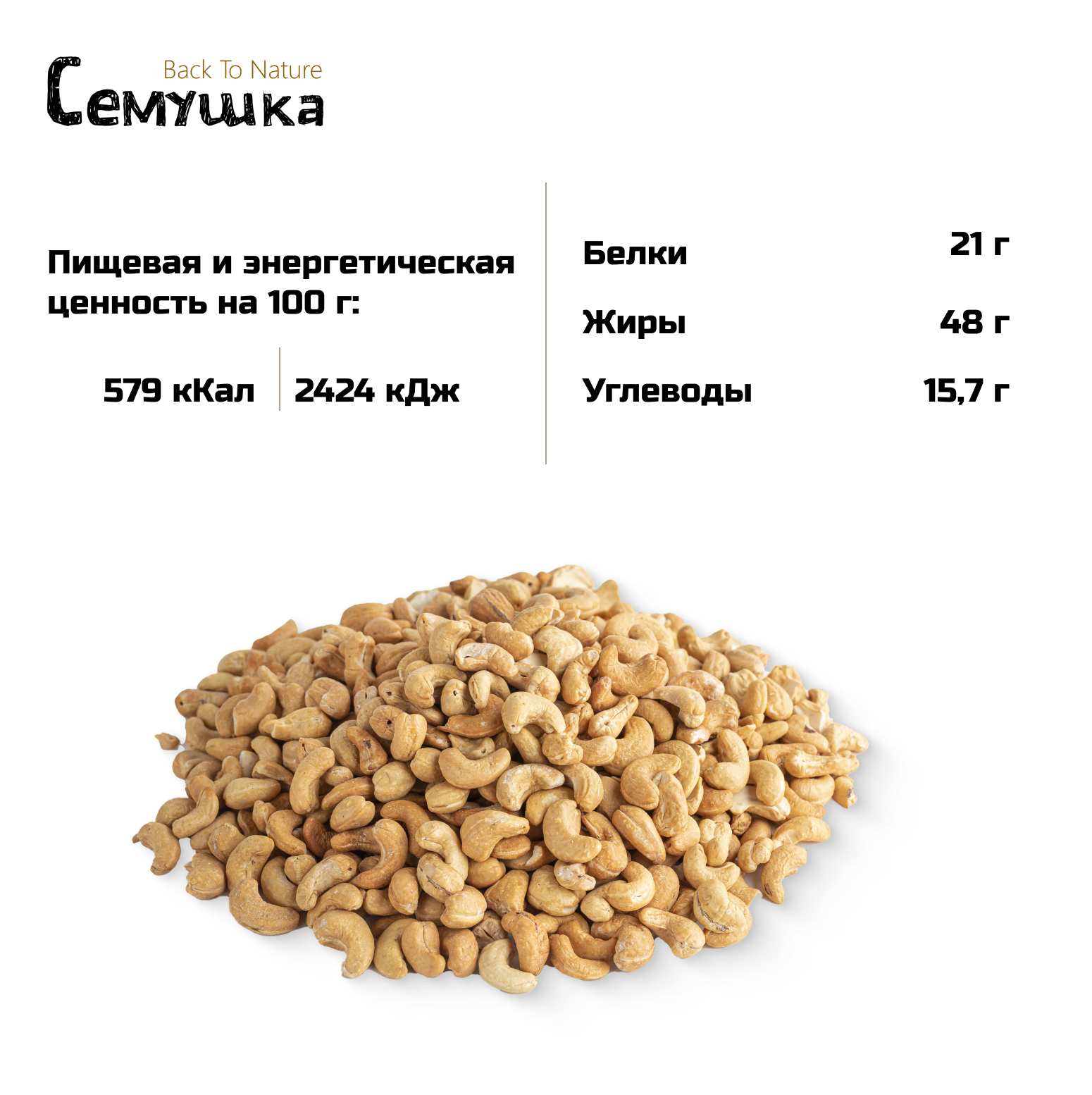 Кешью жареный с солью обладает приятным ореховым вкусом со сливочными нотками. Ядра кешью "Семушка" широко применяются в кулинарии, особенно его любят добавлять в блюда азиатской кухни. Эти орешки очень популярны среди приверженцев здорового питания, а также веганства и вегетарианства. Ядра кешью подходят для производства масла, употребляемого в пищу в качестве заправки к салатам или добавки к супам и гарнирам. Дробленый кешью добавляют в хлебобулочные изделия, торты, каши быстрого приготовления, конфеты, шоколадные батончики. Из кешью делают муку, используемую для выпечки или украшения кондитерский изделий, а также изготовления веганского сыра. Паста из кешью не уступает по популярности и вкусовым свойствам арахисовой, а молоко из этого ореха является отличной альтернативой классическим молочным продуктам.