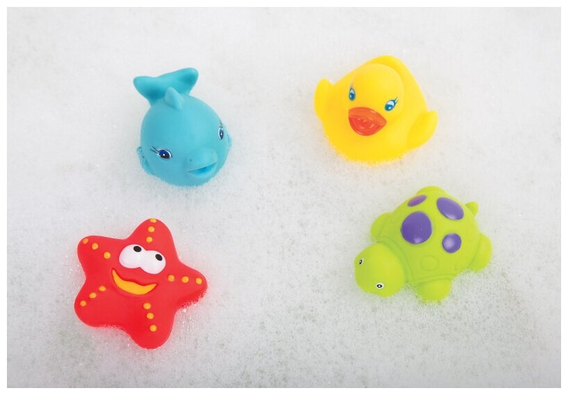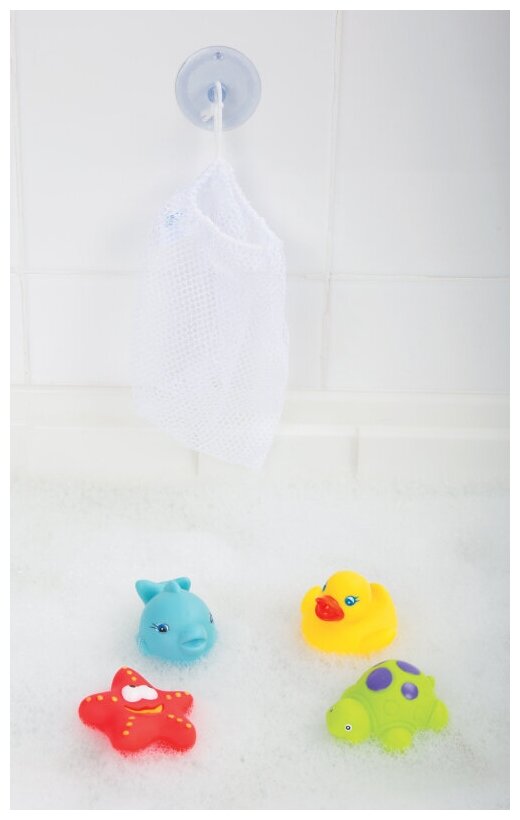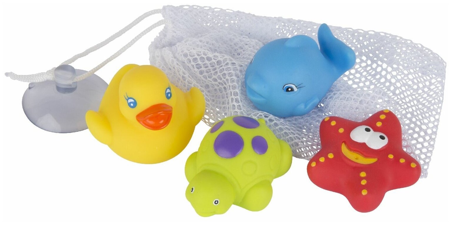 Набор состоит из 4-х разноцветных фигурок: звездочки, черепашхи, уточки и дельфина купания, в комплекте есть мешок с присоской для хранения. Сетчатый мешок для хранения легко моется, поэтому набор отлично подойдет и для игр пляже.